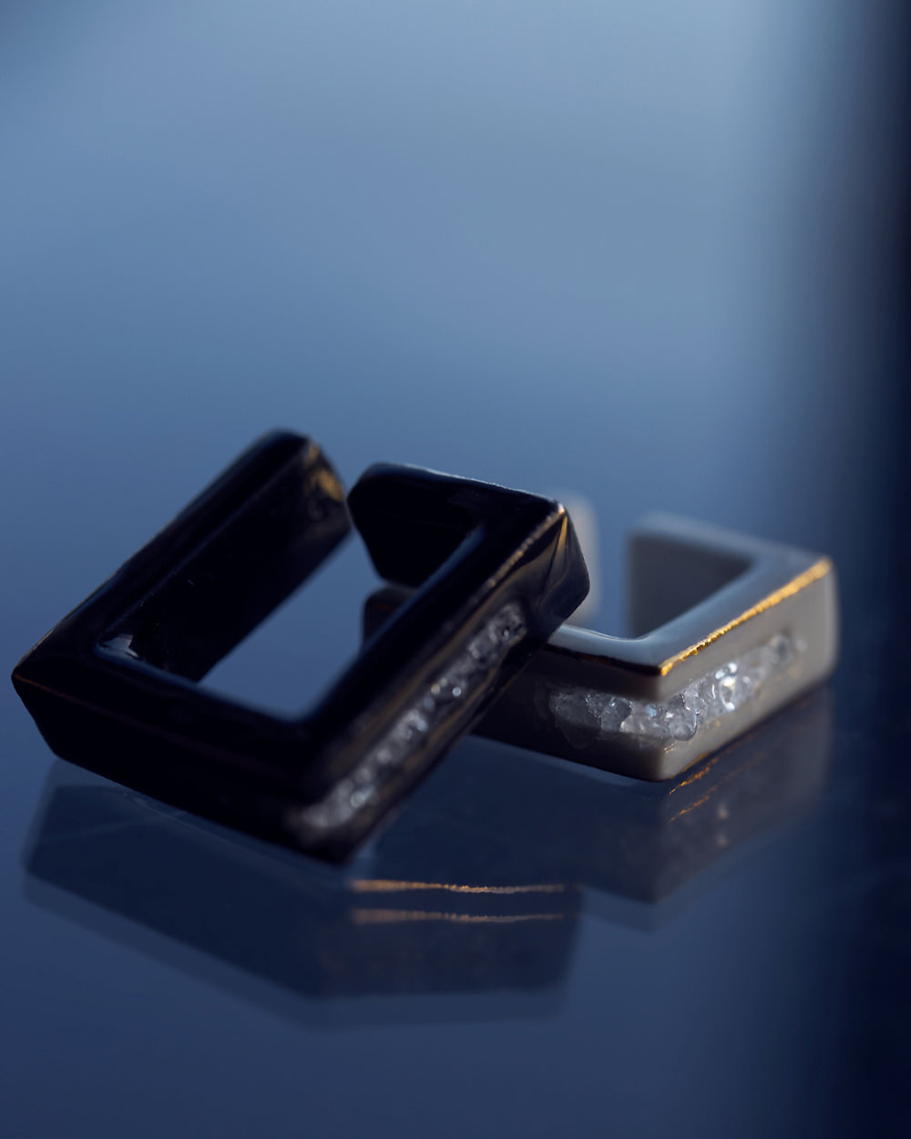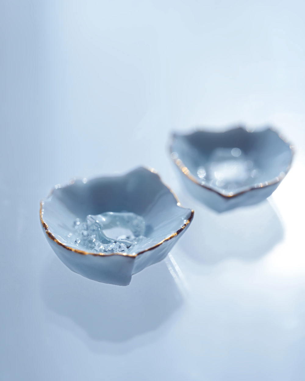 This creative activity began as an experiment, driven by the urge to fuse porcelain and glass.The presence of porcelain and the transparency of glass, the balance of yin and yang by combining contrasting things, is strangely interesting.Porcelain is solid and glass is liquid...